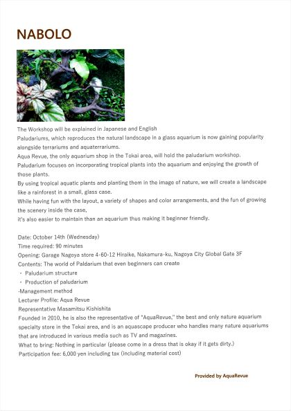 Aqua Revue, the only aquarium shop in the Tokai area, will hold the paludarium workshop.
