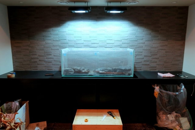 お客様の住宅リフォームが完成いたしました。ADA フルセット120cm水槽を本日設置させていただきました。ご覧の通り壁になど綺麗に施工が完了して、水槽が一層際立ちます。