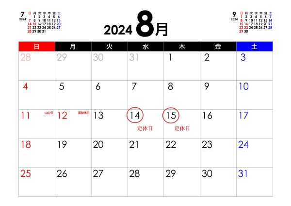 2024/08/10 お盆連休 営業日のご案内 定休日 14日~15日 カレンダーご参照下さい。