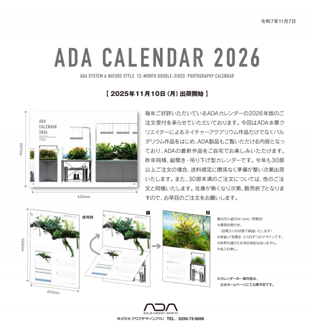 2025/11/07 2026年 ADAカレンダープレゼントのお知らせ お客様各位 日頃は、格別なるご愛顧を賜り厚くお礼申し上げます。 つきましては、お客様へ感謝の気持ちを込めまして 11月14日(金)より店頭にて 税込5,500円以上お買い上げのお客様 に、 先着50名様限定で「2026年ADAカレンダー」(税込1,500円) をプレゼントさせていただきます。 尚、数量限定につき、なくなり次第終了となりますので、予めご了承ください。 皆様のご来店心よりお待ち申し上げます。