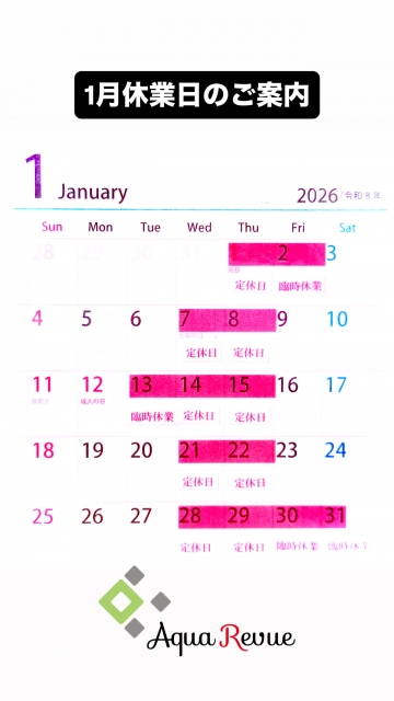 2026/01/04 お客様各位 平素は、格別なるご愛顧を賜わり誠にありがとうございます。 つきましては、右内容にてお休みをいただきます。 休業中ご迷惑をお掛け申し上げますますが、何卒ご理解の程お願い申し上げます。 AquaRevue 店長